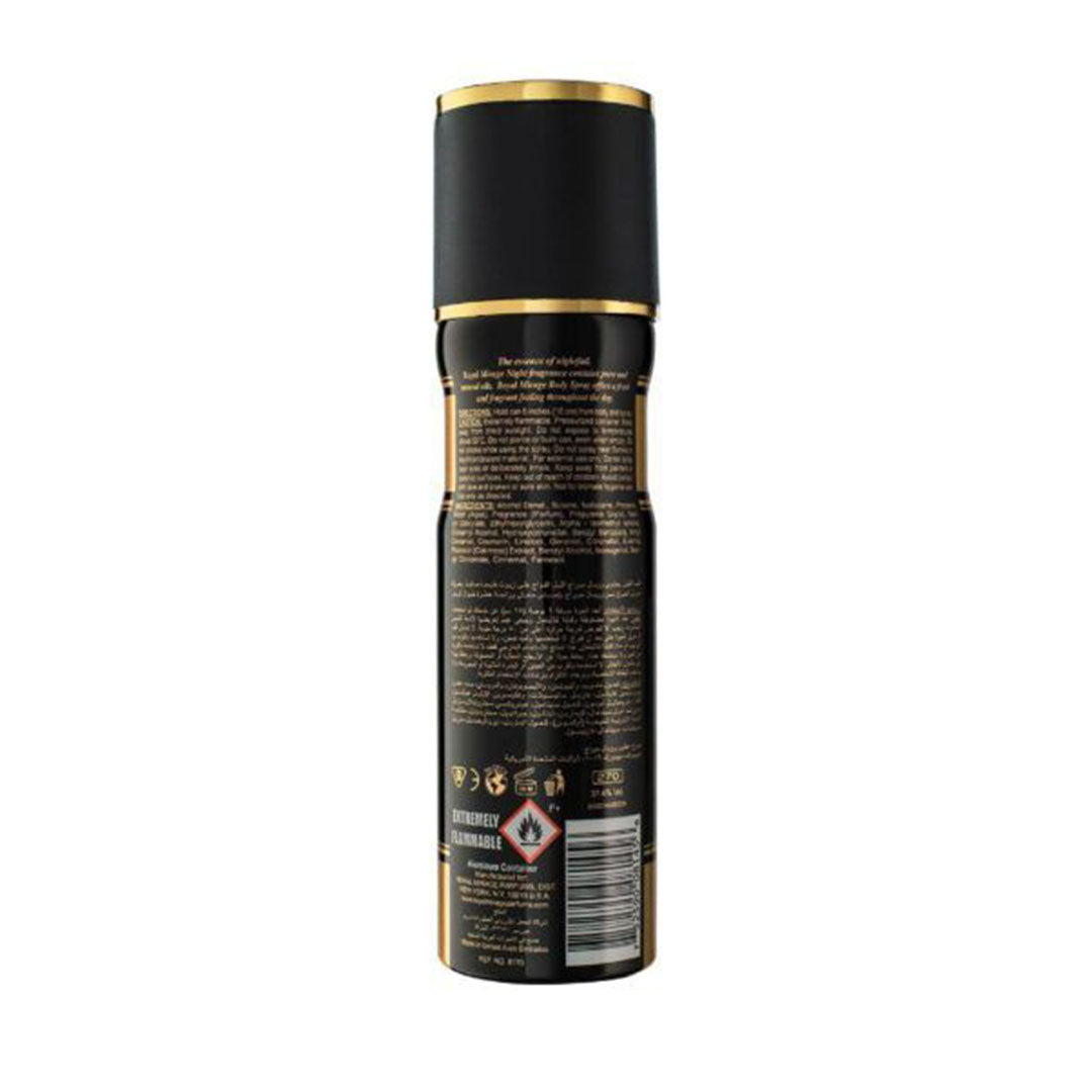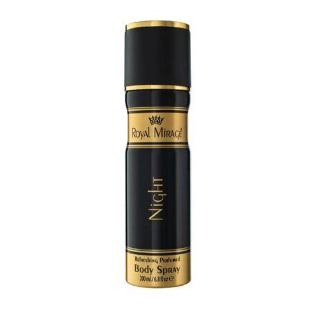 Royal Mirage body sprays contain pure and natural oils. Our body sprays offer a fresh and fragrant feeling throughout the day. The essence of nightfall captured in an alluring mix of evening rose, seductive iris, and delicate jasmine fused with luxurious sandalwood and whispers of sweet musk.