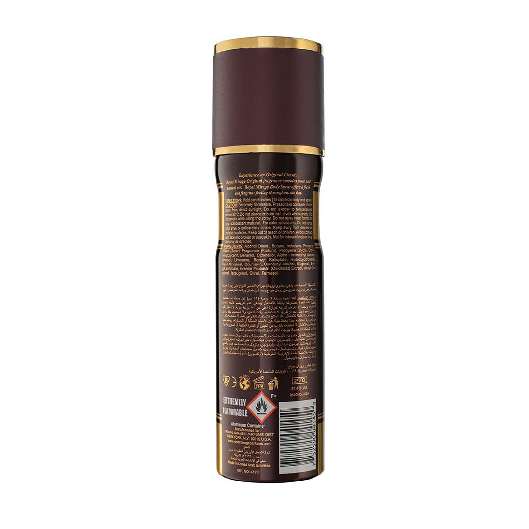 Royal Mirage body sprays contain pure and natural oils. Our body sprays offer a fresh and fragrant feeling throughout the day. A royal classic blending a heart of fresh floralcy enveloped in top notes of sparkling bergamot and luscious greens against a warm background of sensual amber, sandalwood and patchouli for that perfect hint of spice.
