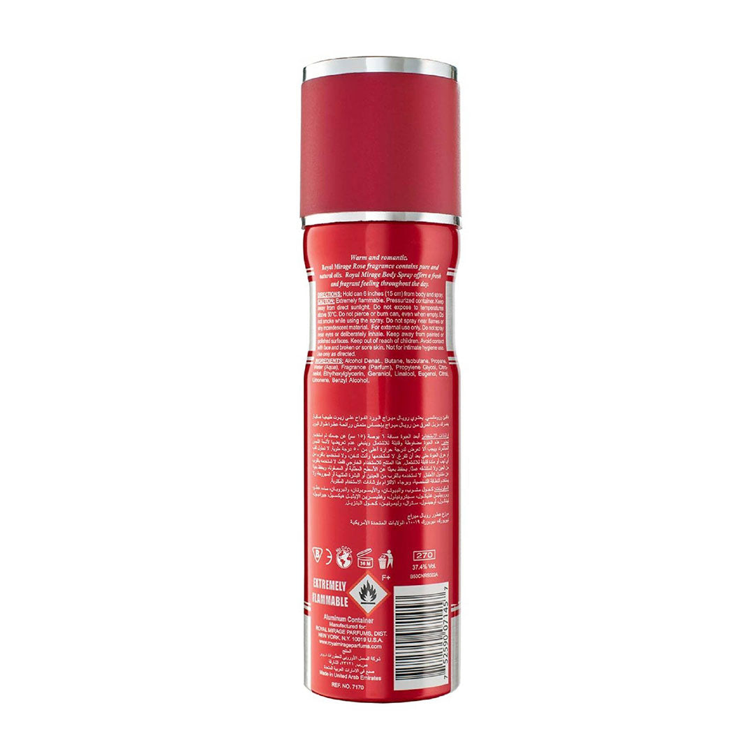 Royal Mirage body sprays contain pure and natural oils. Our body sprays offer a fresh and fragrant feeling throughout the day. A feminine classic and symbol of love. This intensely romantic flower blooms with sweet apricot and peach nuances touched by jasmine, sugary violet notes and a kiss of rose. The scent unwinds to a skin-warming, blend of sensual musk, vanilla and luxurious sandalwood.